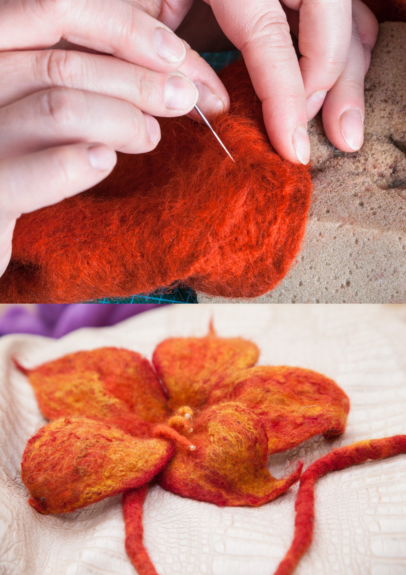 Felting is an ancient technique to create fabric that has been around since at least 6500 BC! Felt is a non-woven textile made of wool or animal fur. There are different ways to create felt: one is with soap and water, and another is with a felting needle. Needle-felting can be a calming, enjoyable, and meditative process due to its repetitive motions. Regardless of the process, the action of felting binds fibers together creating a permanent , irreversible bond.
