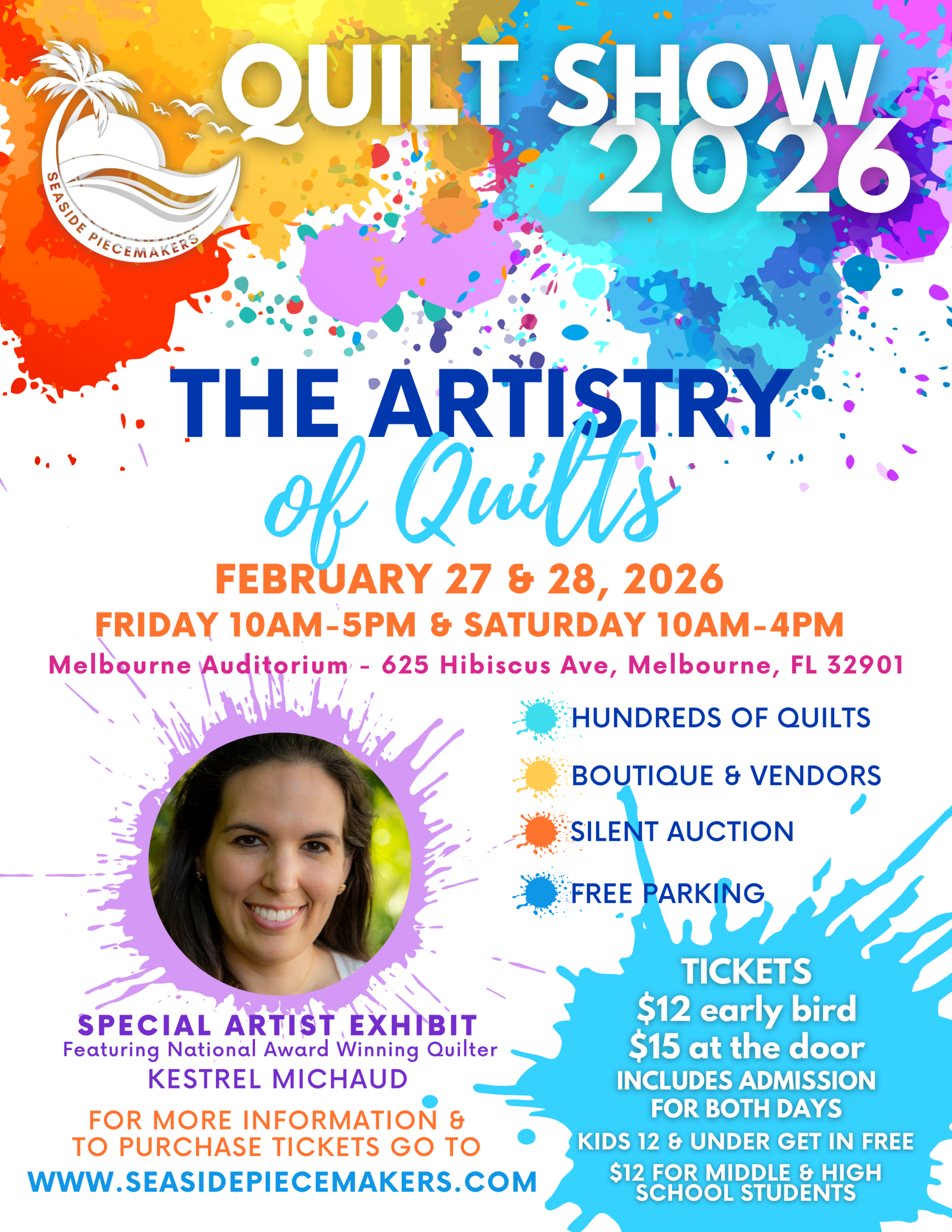 Artistry of Quilts February 27 & 28th at the Melbourne Auditorium + Add to Google Calendar + iCal / Outlook export Date Feb 27 - 28 2026 Expired! Time 10:00 am - 4:00 pm Location Melbourne Auditorium 625 E Hibiscus Blvd Organizer Seaside Piecemakers, Inc. Email seasidepiecemakers.com Website http://www.seasidepiecmakers.com