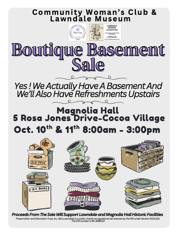 This year, Lawndale is partnering with the GFWC Community Woman’s Club for a similar event that will be held in the basement of Magnolia Hall. Magnolia Hall is the clubhouse for the Community Woman’s Club and is located at 5 Rosa Jones Drive, Cocoa Village.
