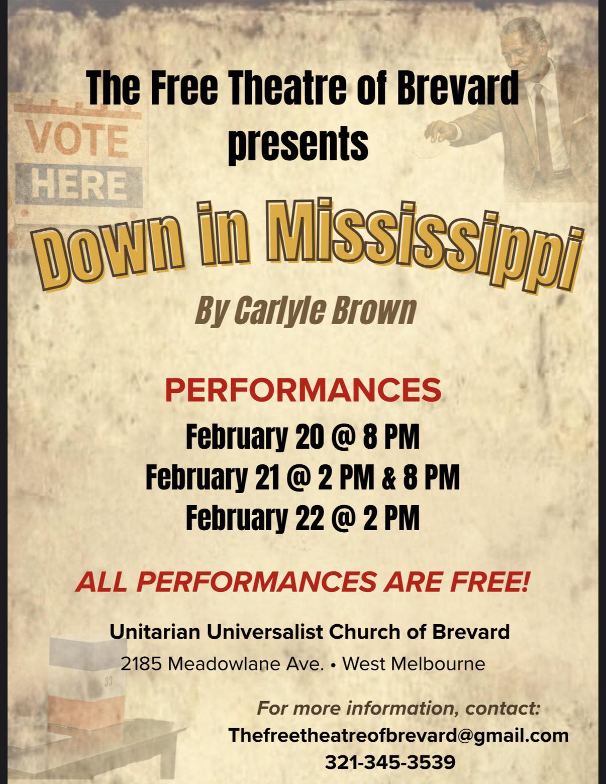 ABOUT DOWN IN MISSISSIPPI—“Down in Mississippi” is a powerful play by Carlyle Brown, written in 2008. Three college students – a black man, a white woman, and a white man—travel to the dangerous world of Mississippi in 1964 to register Negro voters. Along the way, they discover that before they can change the world, they will have to change themselves. “Down in Mississippi” is a celebration of a movement that gave birth to the Civil Rights Act of 1964 and the Voting Rights Act of 1965. It blends historical context, gospel songs, and intense drama to explore the racial tensions of Freedom Summer. The themes deal with civil rights, racial tension, courage, and historical reckoning.