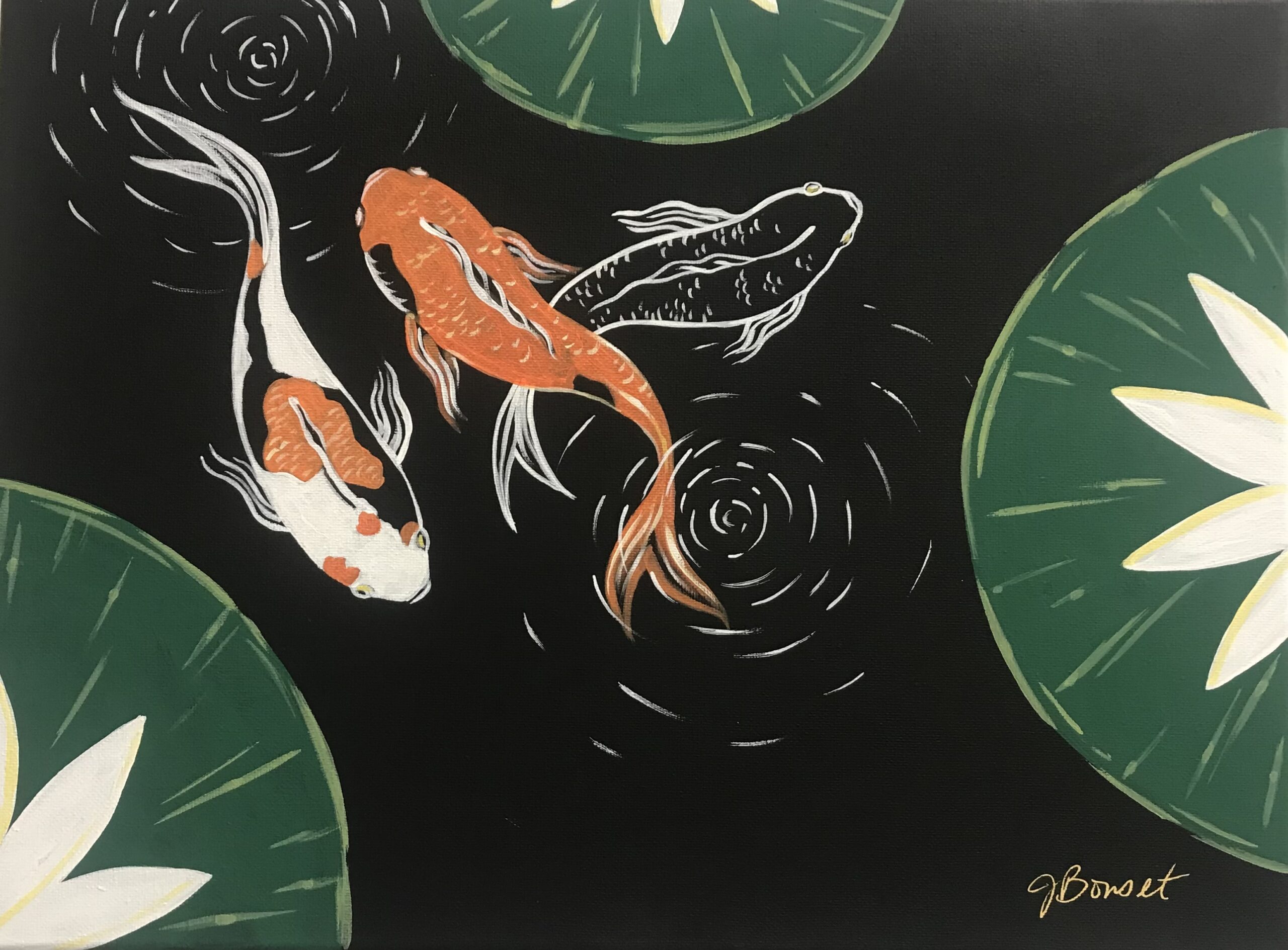 Jennifer Bonset will instruct how to paint this unique Asian inspired Koi fish in Pond, using acrylic paint on a 12 x 16” canvas. Nov. 3rd from 5- 7:30pm.