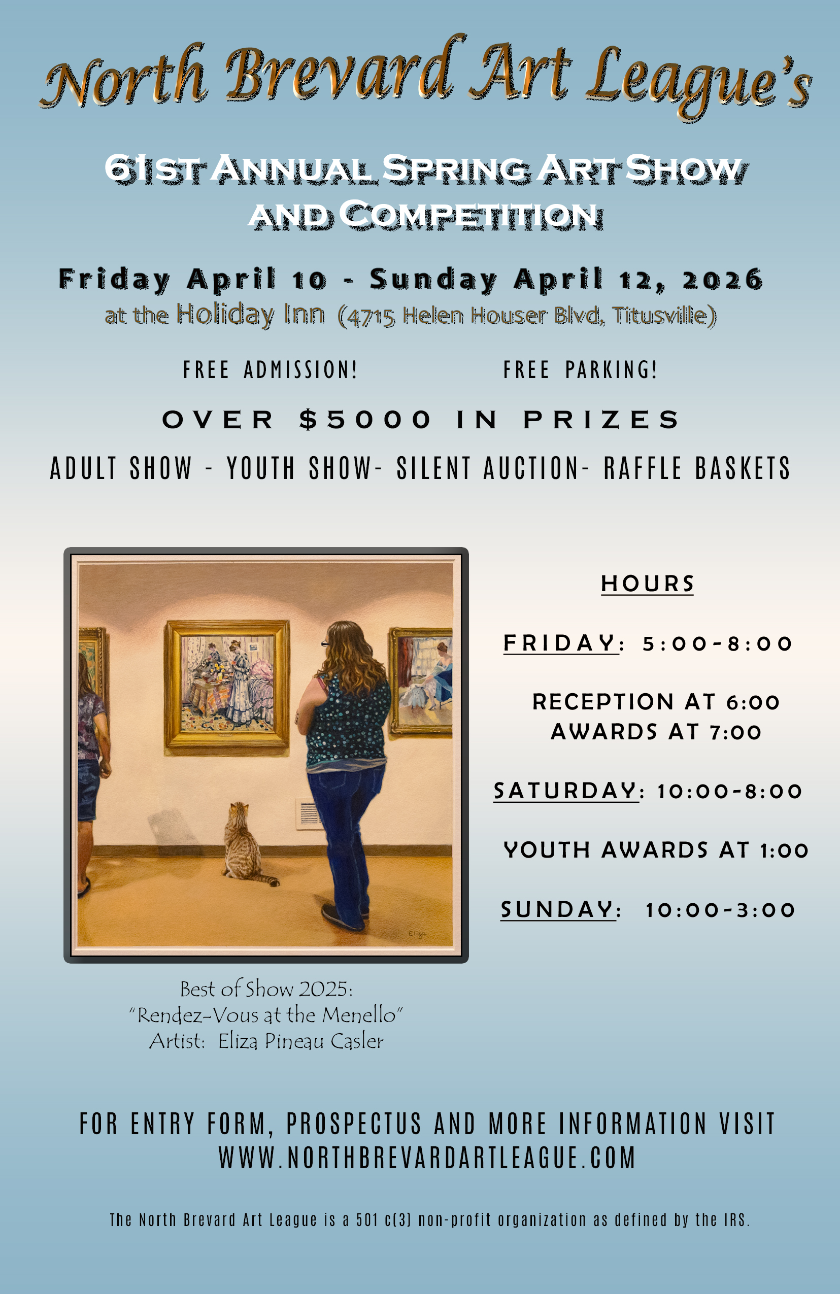 North Brevard Art League 61st Annual Spring Art Show Please come celebrate with us as we announce our 61st Anniversay Spring Art Show! + Add to Google Calendar + iCal / Outlook export Date Apr 10 - 12 2026 Expired! Time 5:00 pm - 3:00 pm More Info Read More Location Holiday Inn Titusville 4715 Helen Hauser Blvd, Titusville FL 32780 Organizer North Brevard Art League Phone 321-383-7441 Email northbrevardartleague@gmail.com Website http://www.northbrevardartleague.com