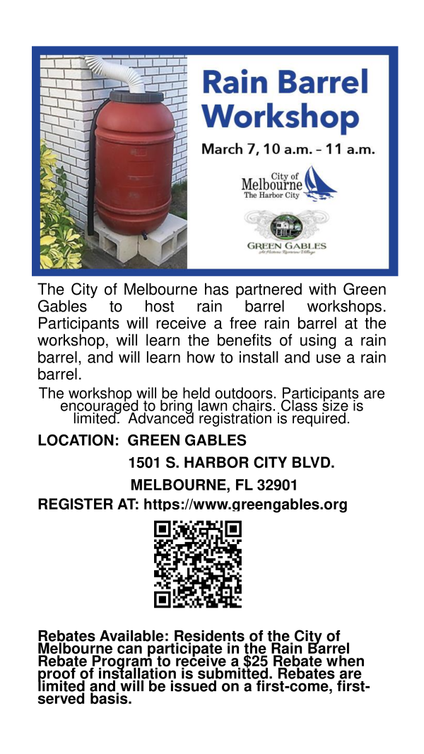 The City of Melbourne has partnered with Green Gables to host rain barrel workshops. Participants will receive a free rain barrel at the workshop, will learn the benefits of using a rain barrel, and will learn how to install and use a rain barrel.