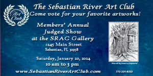 Sebastian River Art Club’s Members’ Annual Judged Show 10 am – 3 pm – SRAC Gallery Join us at our Gallery, 1245 Main Street, Sebastian FL., for our Annual Members’ Judged Show on Saturday, January 20, 2024. This show will feature the best of the original fine art created in a variety of mediums by Sebastian River Art Club artists. Join us and cast your vote for “People’s Choice Award!”